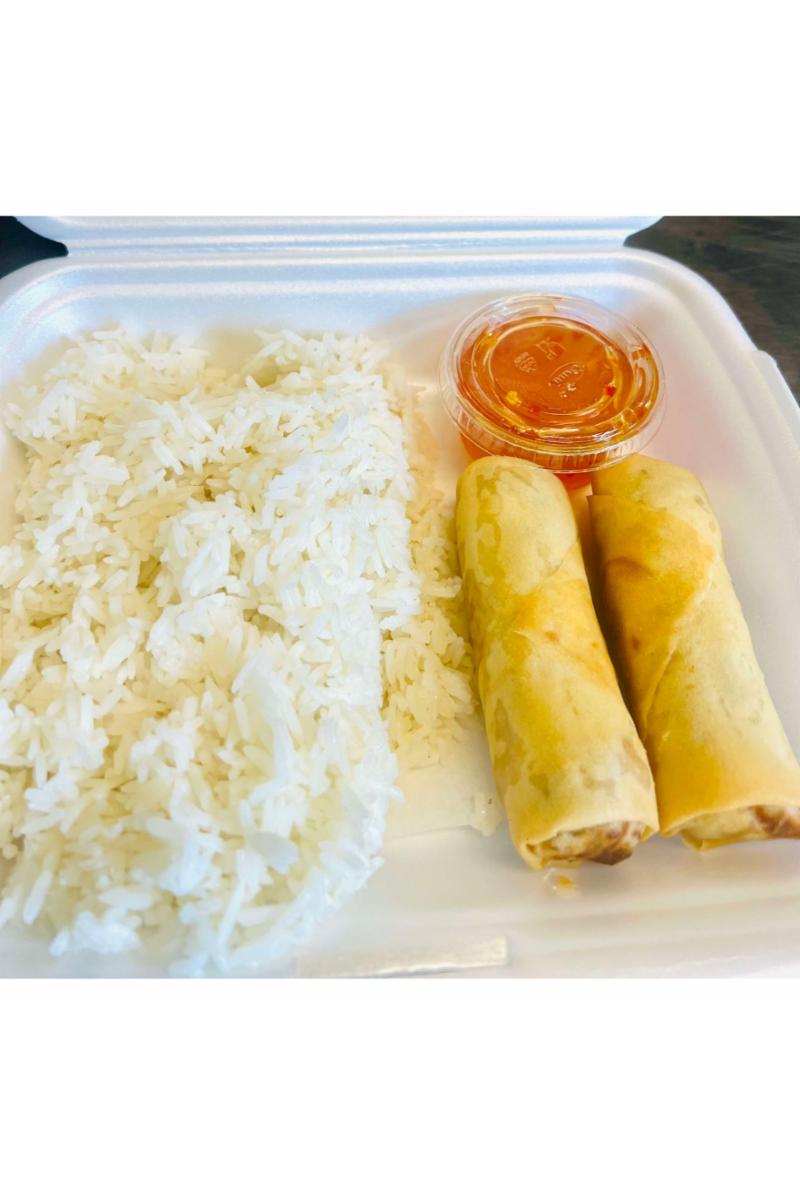 To vårruller, jasminris og søt chilisaus : Allergener: gluten, soya, spor av skalldyr og østers