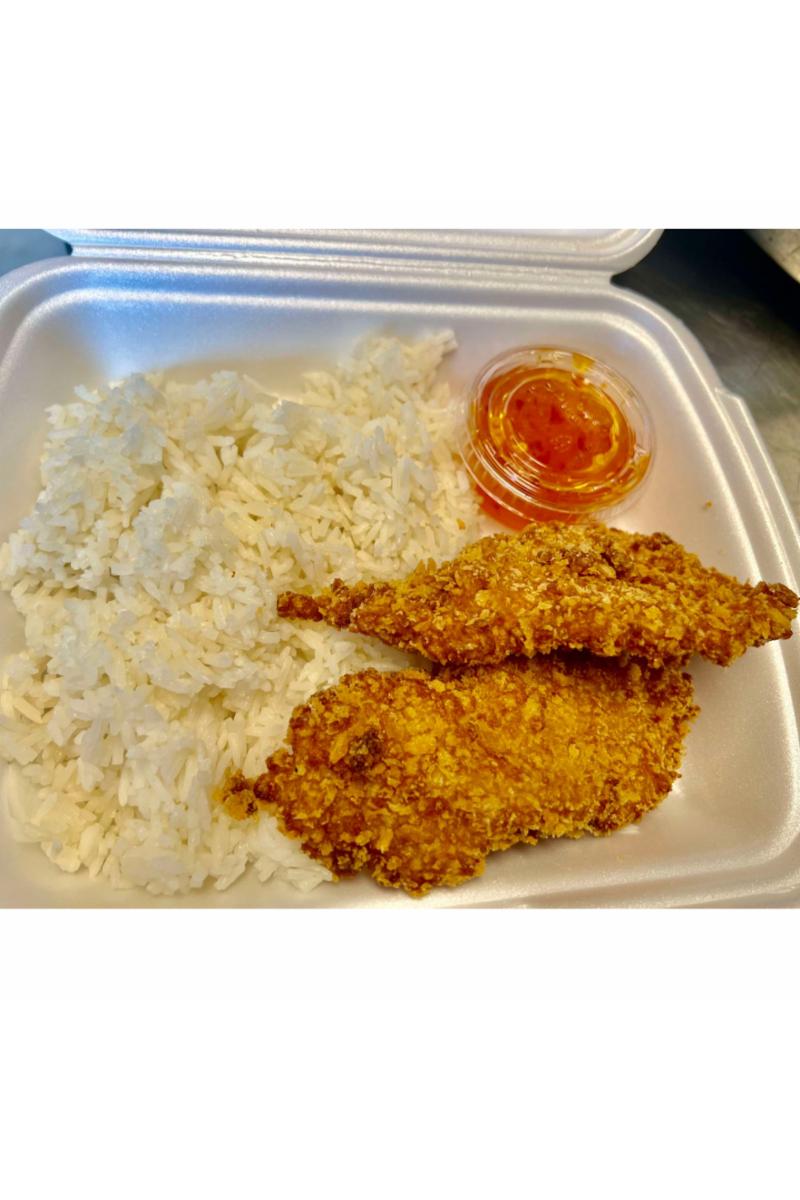To innbakte kylling fileter serveres med jasminris og søt chilisaus : Allergener: gluten, soya, egg, hvetemel, pepper, spor av skalldyr og østers