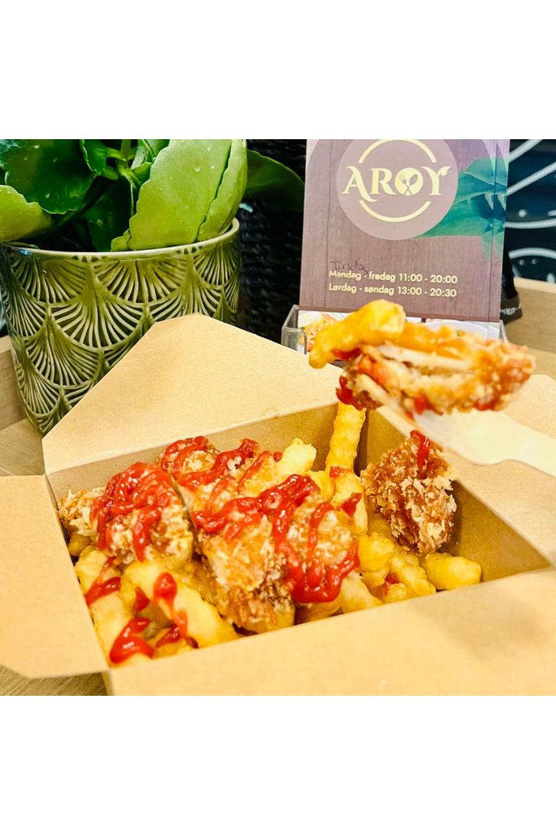 En innbakt kylling serveres med chips : Allergener: gluten, soya, egg, hvetemel, pepper, spor av skalldyr og østers