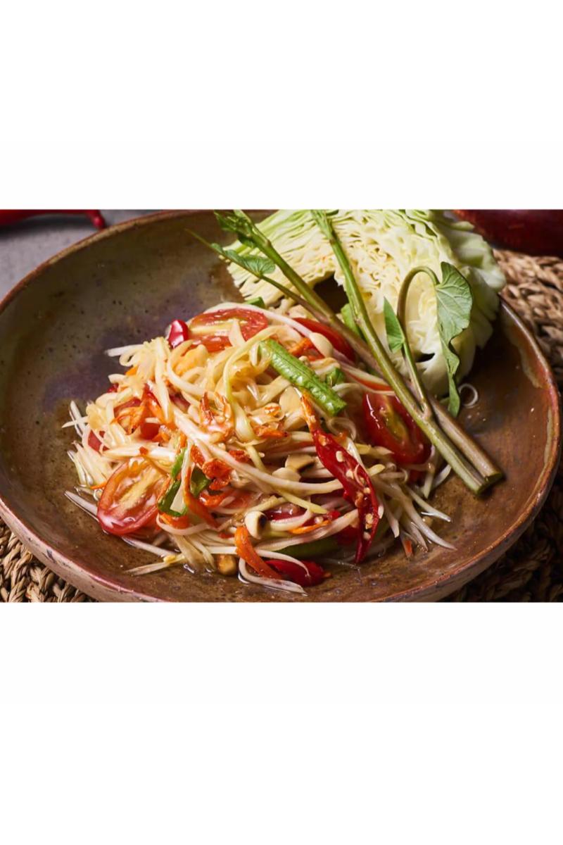 Papayasalat med chili, hvitløk og forskjellige grønnsaker. Servers med jasminris : Allergener: gluten, soya, østers og spor av fisk og skalldyr