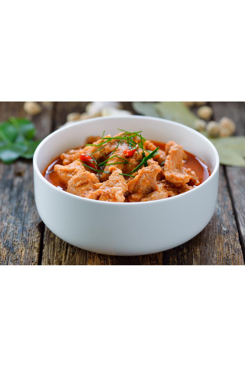 Rød karrigryte med svin eller kylling, gulrot, paprika, løk, squash, chili og limeblad, serveres med jasminris (sterkt) : Allergener: gluten, soya, melk, kokosmelk og østers