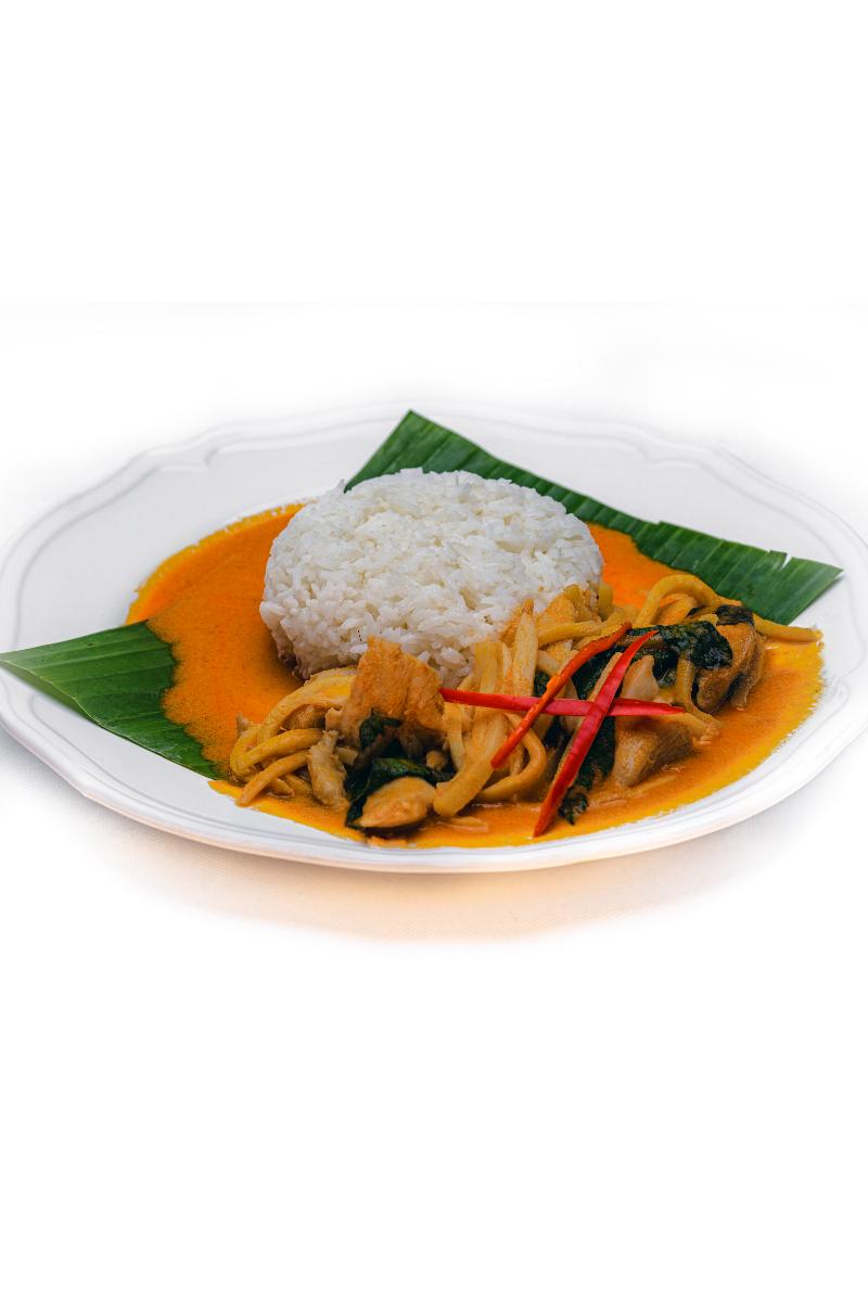 Kylling i rød karrisaus, bambuskudd, sweet basil, grønnsaker og kokosmelk, serveres med jasminris : Allergener: gluten, soya, melk, kokosmelk, spor av skalldyr og østers