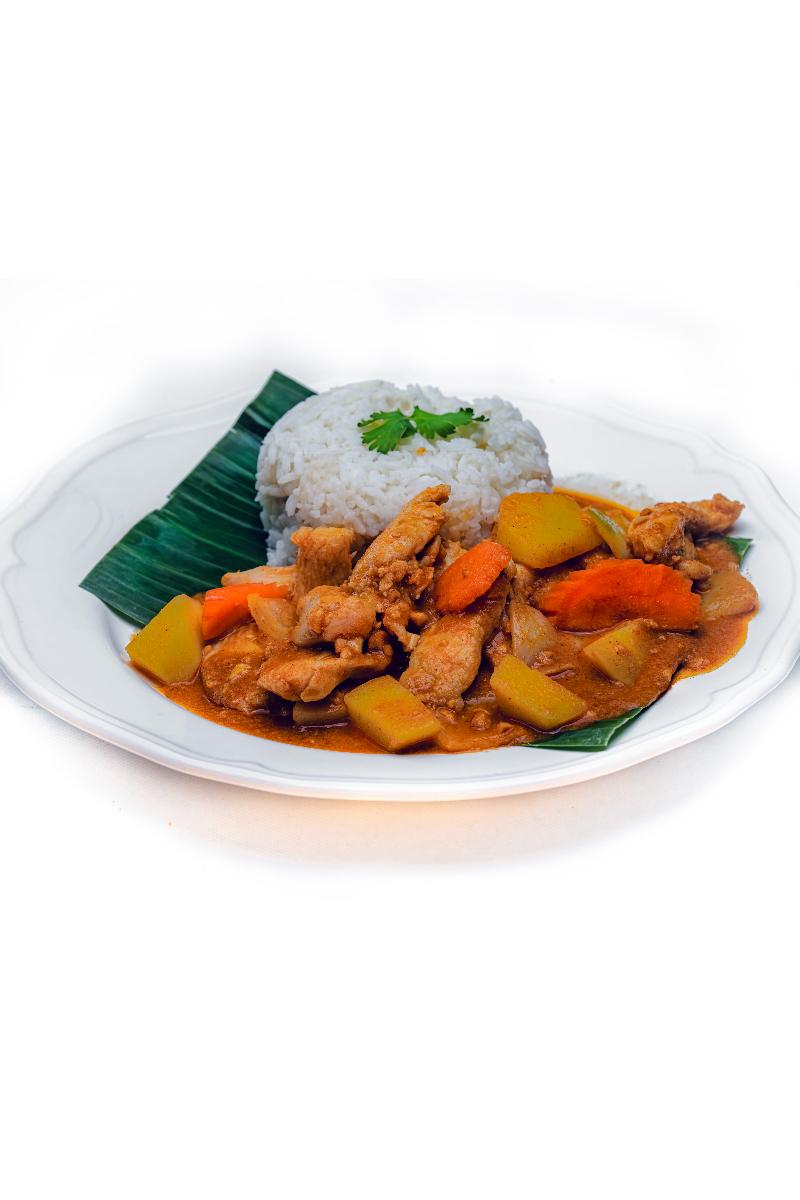 Kylling i massaman karrisaus med poteter, løk, gulrot, peanøtter og kokosmelk, serveres med jasminris : Allergener: gluten, soya, melk, kokosmelk, peanøtter og østers