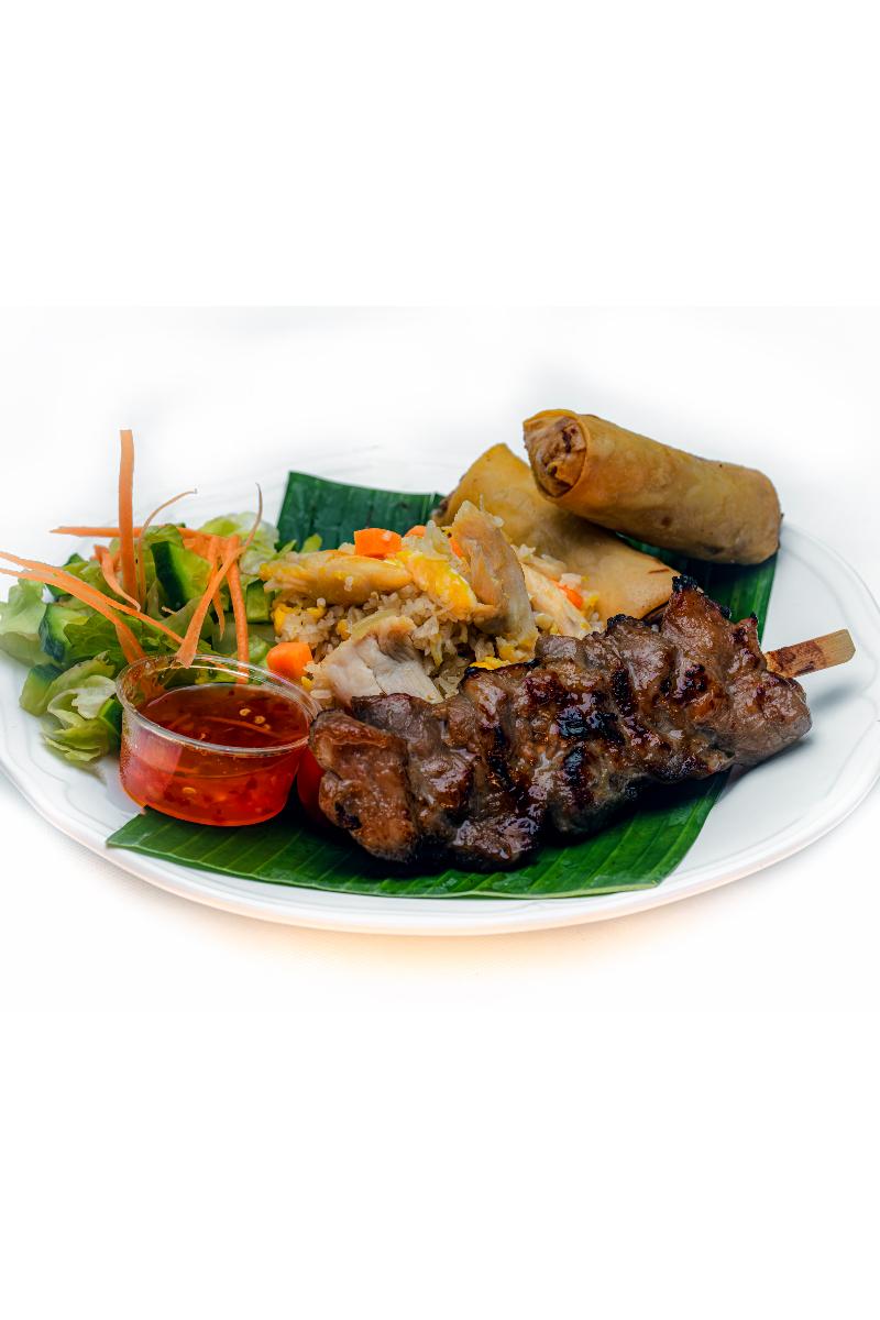 Stekt ris eller stekte nudler 2 vårruller, et spyd av svin eller kylling med salat og søt chilisaus : Allergener: gluten, egg, pepper, soya, østers og spor av fisk og skalldyr