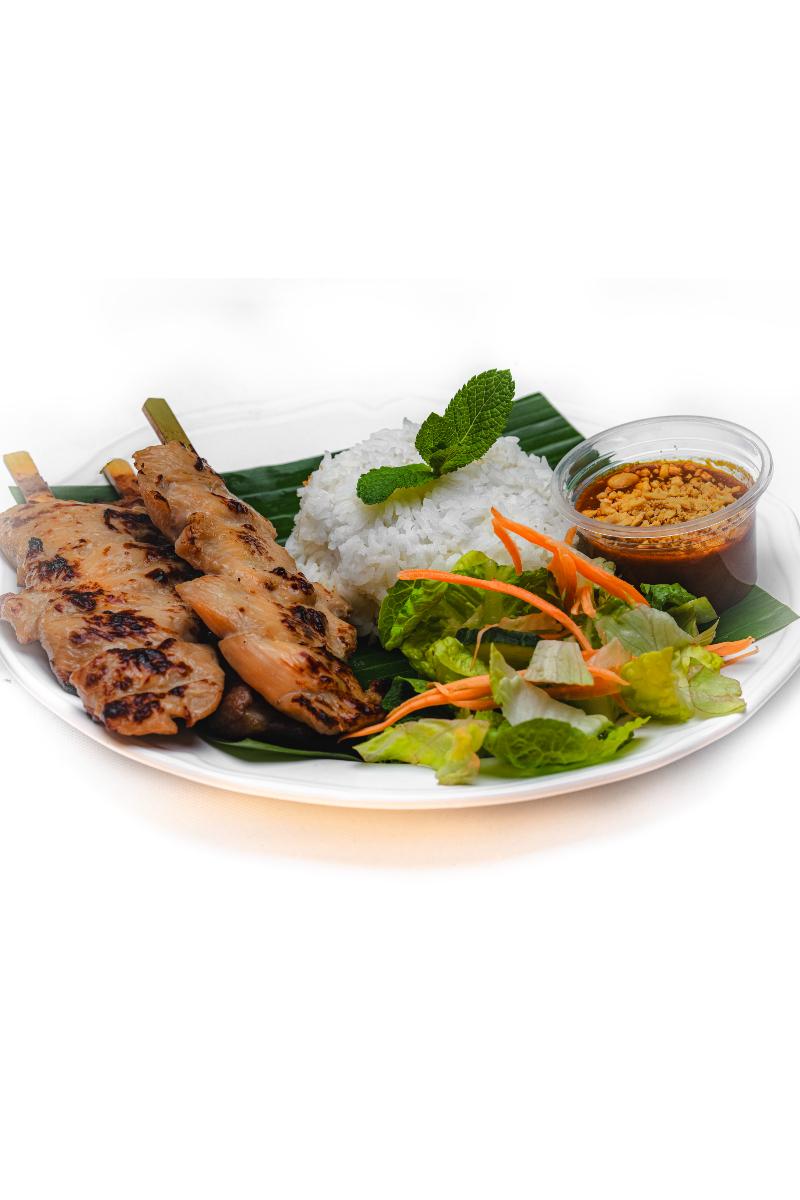 3 grillet kyllingspyd med satay peanøttsaus serveres med salat og jasminris : Allergener: gluten, kokosmelk, pepper, soya, spor av skalldyr og østers