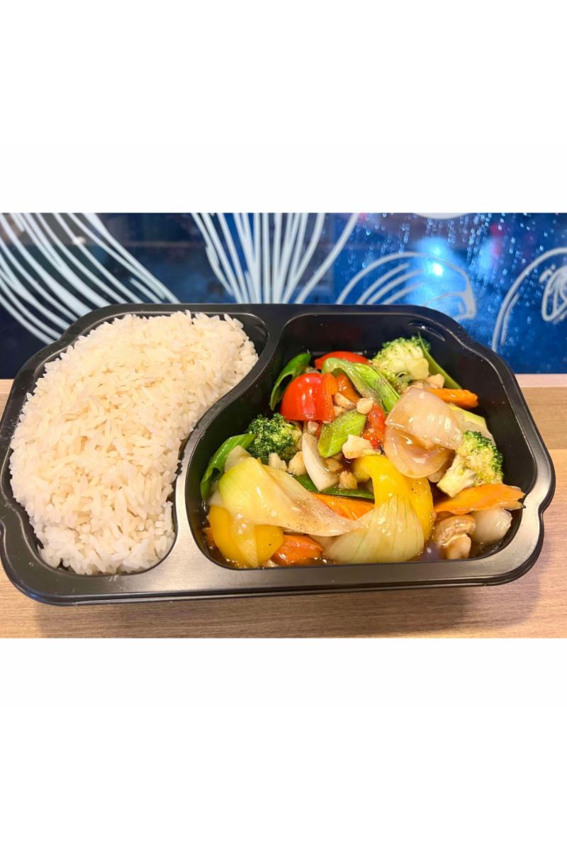 Stekt grønnsaker og serveres med jasminris : Allergener: gluten, soya, spor av skalldyr og østers